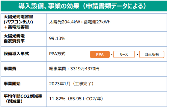 自家消費率は99%超で、204kWの発電量を自家消費し、年間のCO2削減率は約11.8%となっています。