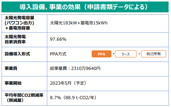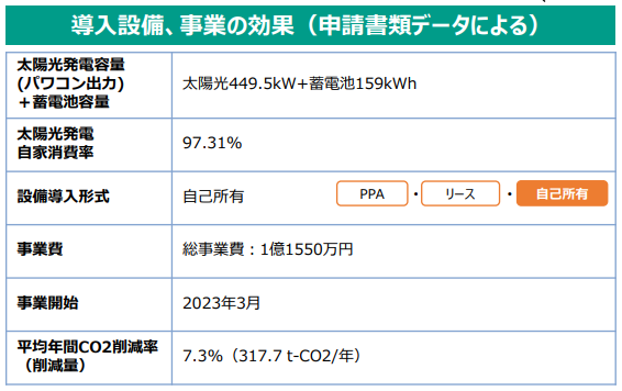 太陽光発電システムと蓄電池の導入により、消費電力量の約9.6%をCO2ゼロにできる見込みとのことです。