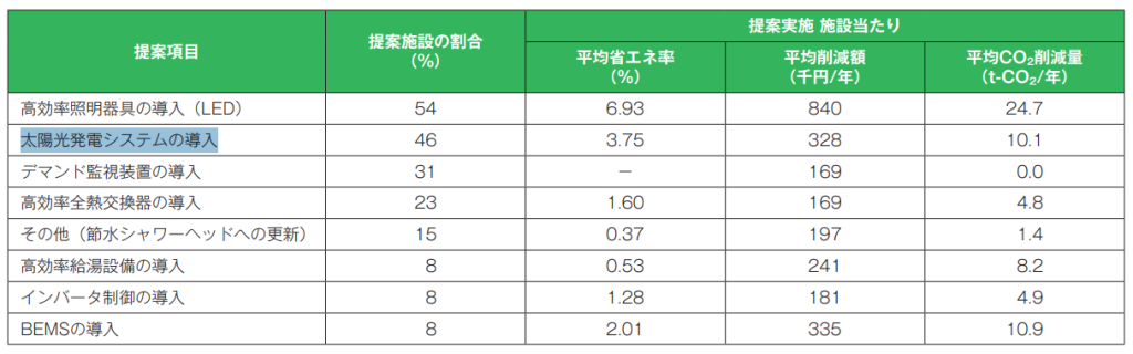 また、東京都環境局が事業者アンケートなどの結果に基づきまとめた資料の中でも、介護施設における省エネ効果性を考えた際、LED照明への切り替えにつづいて太陽光発電システムの導入をおすすめしている実態があります。