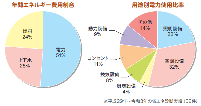 建築地・床面積・業態によって様々ですが、比較的空調設備と照明設備で電力を多く使用している実態がわかります。