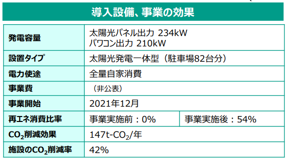 | ソーラーカーポート事業に取り組むきっかけ(下記3点の実現に努める) ①平時における温室効果ガス排出の抑制 ②カーポート設置による、雨天時などの駐車場利用の利便性向上 ③災害等の非常時において必要最低限な店舗運営が可能なエネルギーの供給(BCP対策の一環) • 事業実施に当たって特に注意した点 災害等の非常時の店舗営業では、パワーコンディショナーをPOSシステム用コンセント及び非常用コンセントとして活用する設計としている。 • 課題と工夫点 前方に支柱のない「片持ち」施工で駐車のしやすいカーポート施工を実現した。 当該事業により、同社他店舗で当該スキームの水平展開が期待できる。 ※環境省資料引用 |