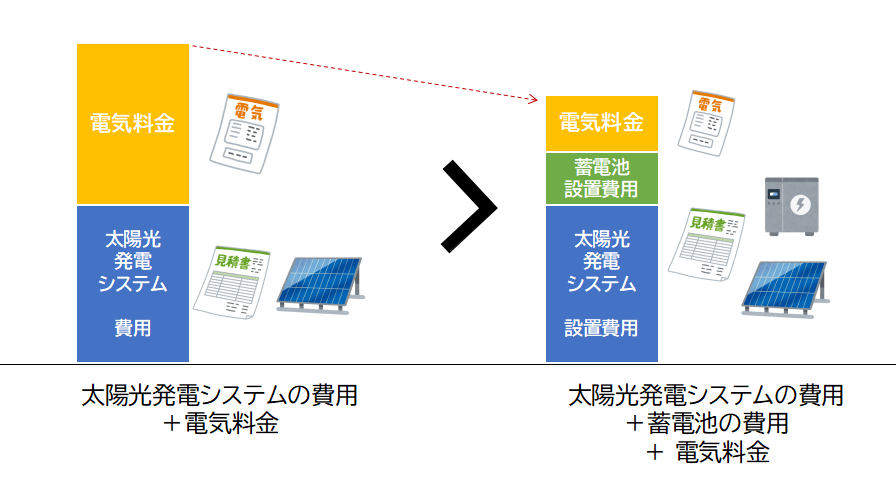 つまり、上図のように「太陽光発電システムの初期費用+月々の電気料金」よりも、「太陽光発電システム+蓄電池の初期費用+月々の電気料金」のほうが安くなる状態となります。