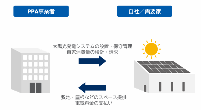 太陽光発電システムを設置した事業者(需要家)は、建物の敷地や屋根などのスペースを提供し、PPA事業者はその敷地や屋根に太陽光発電システムの設置・管理などを行ないます。