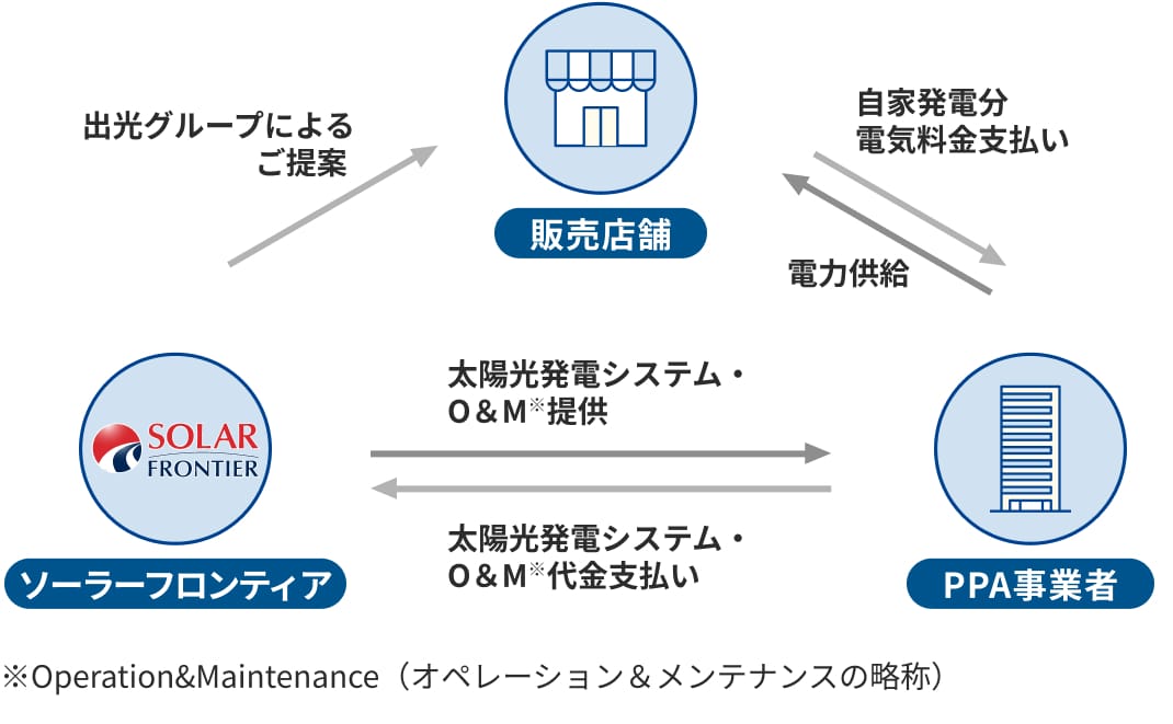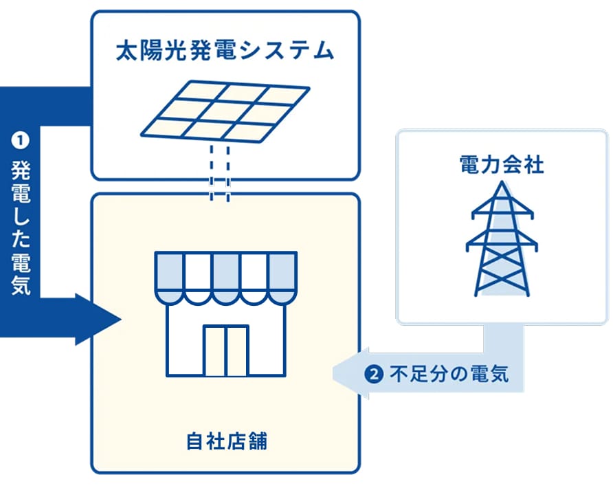 Power Purchace Agreement(PPA:電力販売契約)により、PPA事業者がお客様の店舗の屋根に太陽光発電システムの無償設置を行います。システム運用時、お客様は自家消費分の電気料金をPPA事業者に対して支払います。