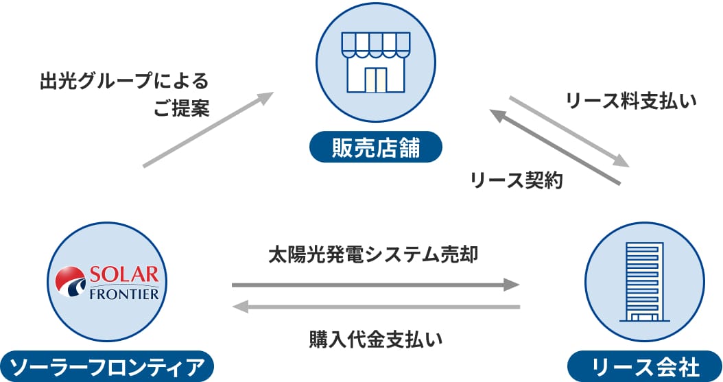 リース会社を介し、お客様の店舗の屋根に太陽光発電システムの無償設置を行います。システム運用時、お客様は定額料金をリース会社に対して支払います。